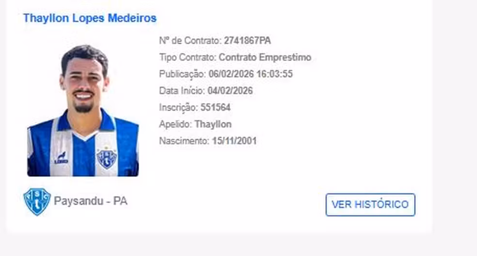 Na tarde dessa sexta-feira, 6, o Paysandu anunciou a contratação do atacante Thayllon, de 24 anos. Ele chega por empréstimo do Atlético-GO para fortalecer o time bicolor na continuidade da temporada de 2026.