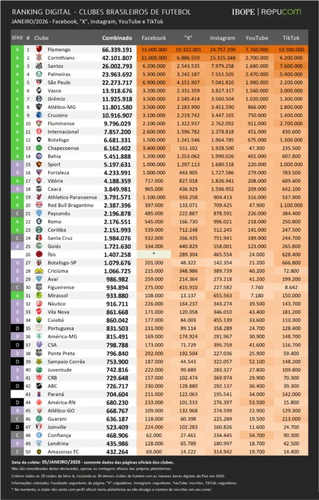 O Paysandu também encerrou 2025 com um saldo positivo, embora o Papão tenha enfrentado um dos piores anos de sua história, o clube conseguiu não apenas preservar sua base de público no ambiente digital, onde ocupa a 13ª posição no ranking de crescimento anual, mas também registrou 146.551 novas inscrições, representando um aumento de 7% em sua base digital.