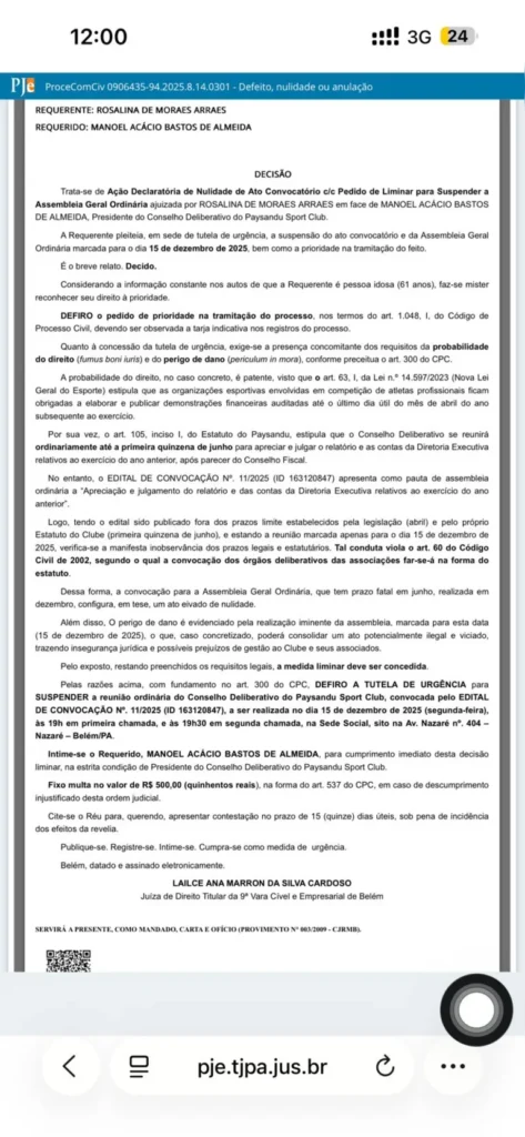 A Justiça do Pará decidiu suspender a Reunião Ordinária do Conselho Deliberativo do Paysandu, agendada para esta segunda-feira (15). Após questionamentos sobre a legalidade do edital de convocação, a 9ª Vara Cível e Empresarial de Belém proferiu a decisão.